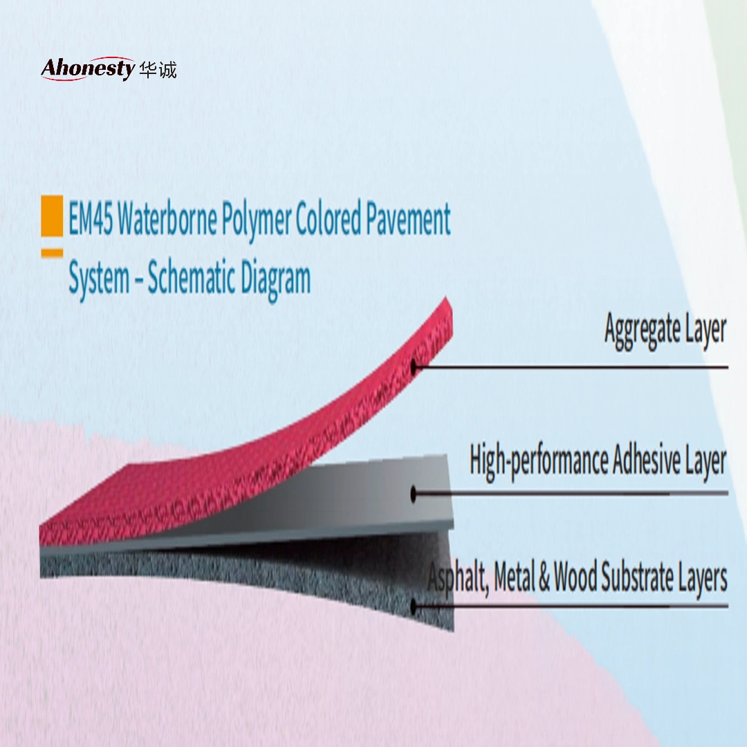 EM45 Waterborne Polymer Colored Pavement is an innovative pavement system based on a hybrid composition of high-performance waterborne polymers and inorganic aggregates. Through the use of specially formulated waterborne polymer binders and matching aggregates, it forms a highly weather-resistant and mechanically robust integrated surface layer.