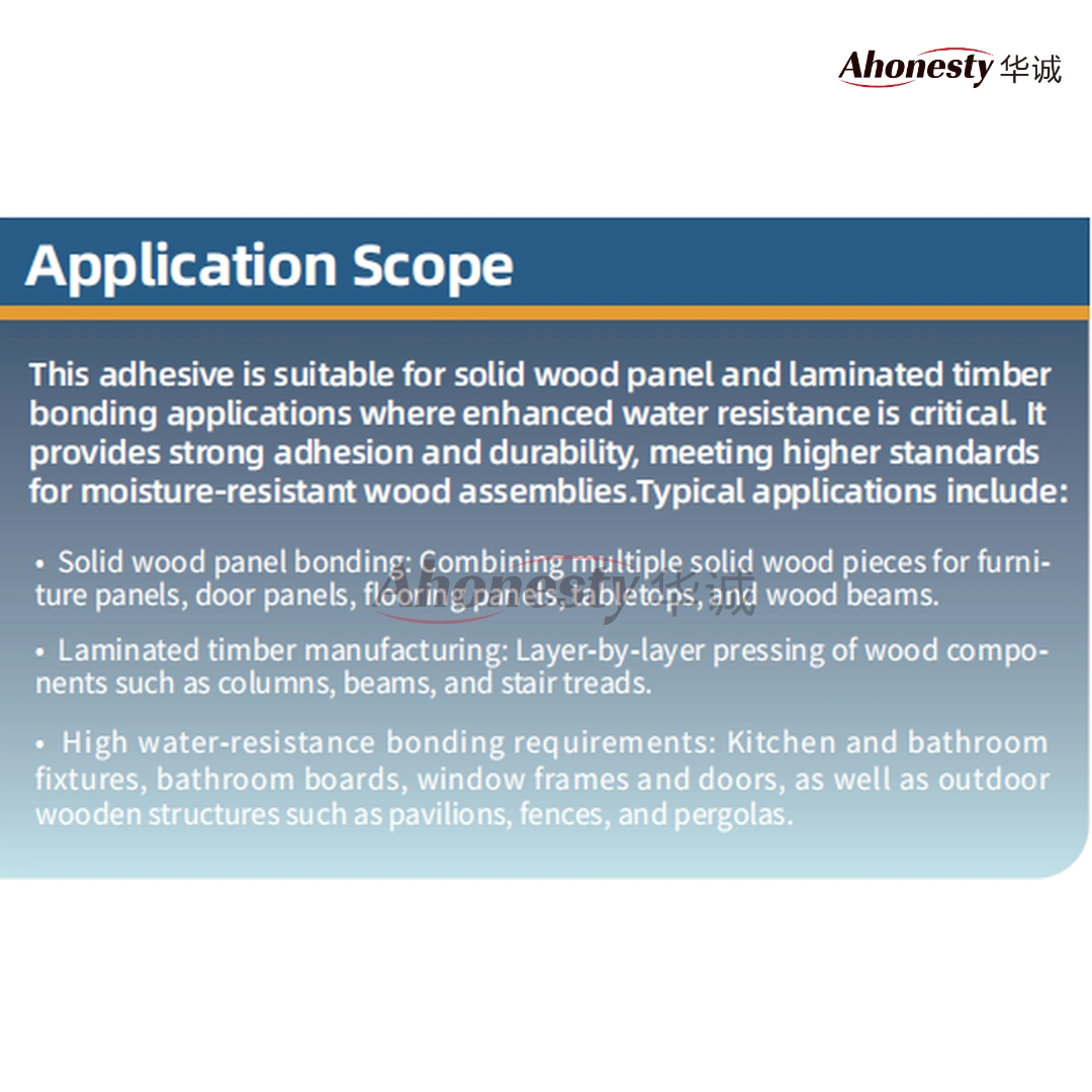 - When combined with a curing agent, it reaches the D4 standard, providing excellent water resistance to meet high-standard woodworking bonding requirements.